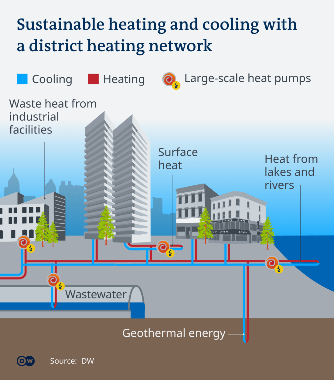 Large power plants burning gas, oil or coal supply most heating networks. Some also use waste heat from nuclear power plants and deep geothermal energy. But in recent years, suppliers are increasingly adding waste incineration, bioenergy and large solar thermal plants, as well as heat pumps to the mix.