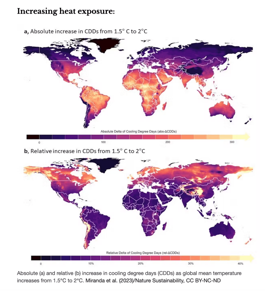 We modelled climate scenarios at both 1.5℃ and 2℃ of global warming, using a concept called “cooling degree days” to quantify exposure to uncomfortable temperatures. Cooling degree days help us assess when people will need to take extra measures, like switching the air-conditioning on, to keep themselves cool.