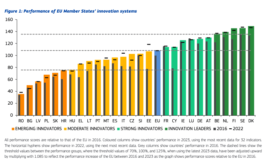 Belgium, Denmark, Finland, the Netherlands, and Sweden are Innovation Leaders with innovation performance well above the EU average (>125% of EU average). Austria, Cyprus, France, Germany, Ireland, and Luxembourg are Strong Innovators with performance above the EU average. Czechia, Estonia, Greece, Hungary, Italy, Lithuania, Malta, Portugal, Slovenia, and Spain are Moderate Innovators with performance below the EU average. Bulgaria, Croatia, Latvia, Poland, Romania and Slovakia are Emerging Innovators with performance well below the EU average (<70% of EU average).
