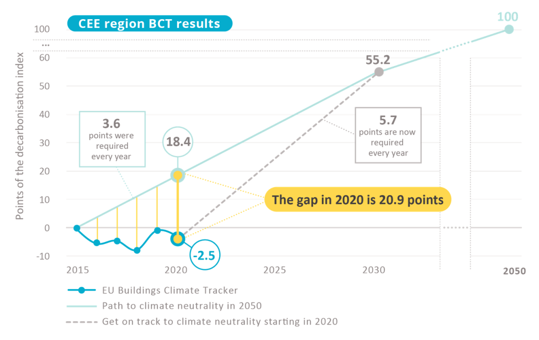 The analysis for the Central and East European countries shows an even more worrying trend: by 2020 the progress to decarbonise the building stock is 21 points off the required decarbonisation path, the largest gap since the beginning of the tracker period in 2015. This requires a significant increase of efforts to implement effective policies in the near future. Based on the current situation, 5.7 points of progress in decarbonisation are required every year in the CEE region to get on track by 2030.