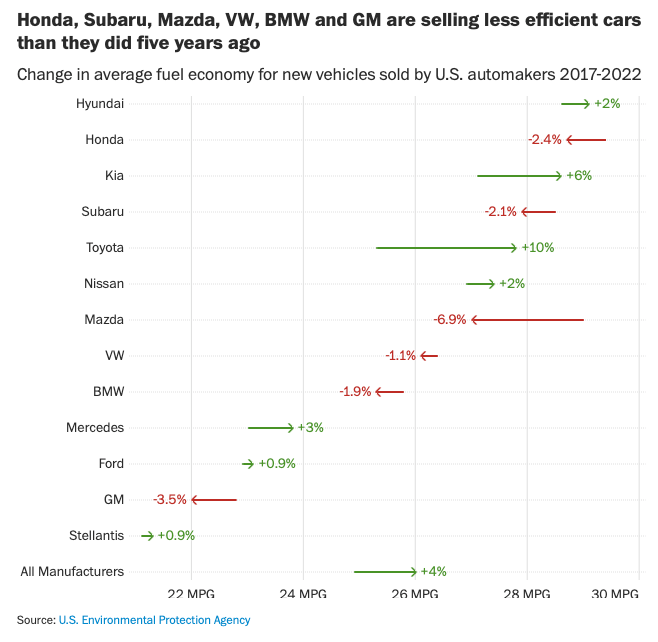 And Mazda is not alone. Five other automakers — Honda, Subaru, Volkswagen, BMW and GM — sold cars that were less efficient, on average, in 2022 than in 2017.