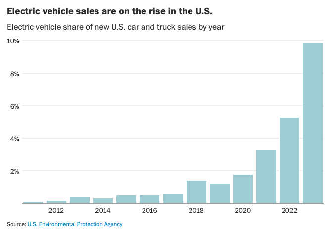 That day is getting closer. Electric vehicle sales are rising in the United States. Last year, nearly 10 percent of cars and trucks sold here were electric, according to EPA data. Hybrids made up a similar share of sales.