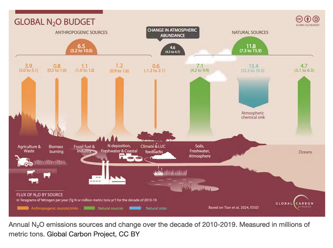 Nitrogen fertilizers, widely used in agriculture, are one of the biggest contributors. Fertilizers are responsible for 70% of total agricultural N₂O emissions globally. Animal manure from intensive animal farming contributes around 30%. A smaller source but one that is rapidly growing is aquaculture, such as fish farming, particularly in China where it has increased twenty-fivefold in the past 40 years.