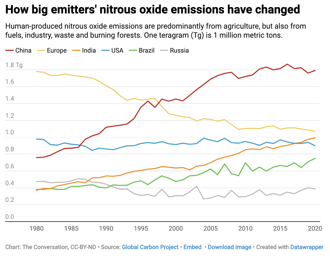 Emerging economies, such as China and India, have had strong increasing N₂O trends over the past four decades as they boosted agricultural productivity to meet their growing populations’ food demand.
