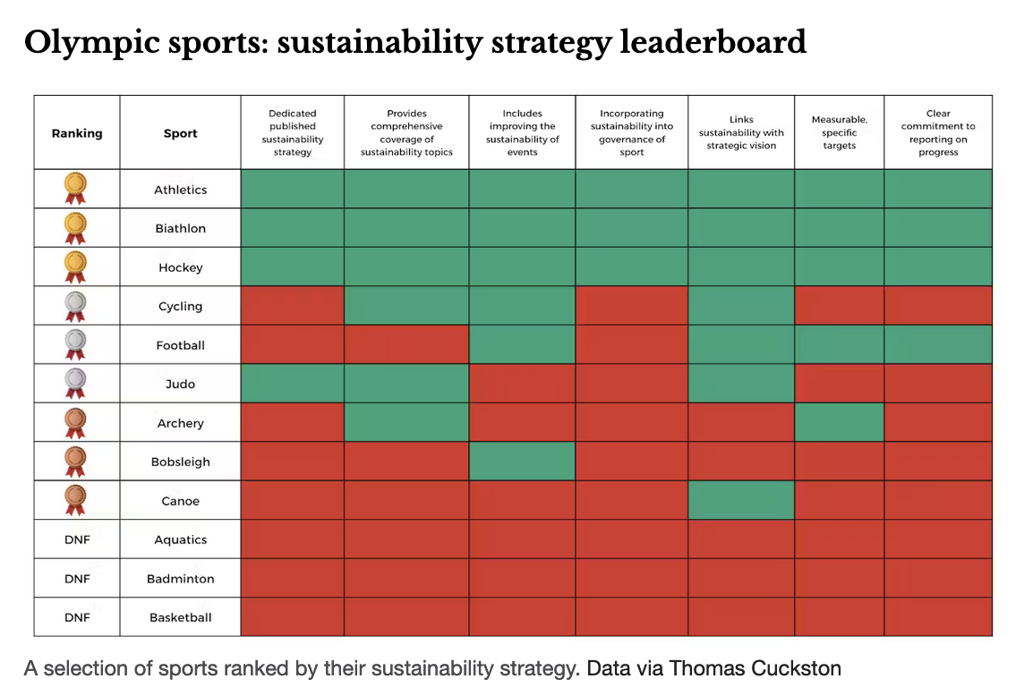 Ahead of the 2024 games in Paris, the International Olympic Committee (IOC) asked all Olympic sports to prepare sustainability strategies. Sustainability, it said, was central to the Olympic movement. But some sports didn’t respond at all, and there is a wide gap between the best and worst performers.