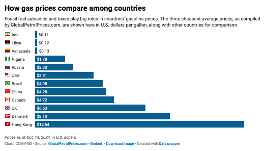Oil, for example, is traded on a global market, but the price per gallon of petrol varies enormously around the world, from about 10 cents in Iran, Libya and Venezuela – where it is heavily subsidized – to over $7 in Hong Kong, the Netherlands and much of Scandinavia, where fuel taxes counteract subsidies.