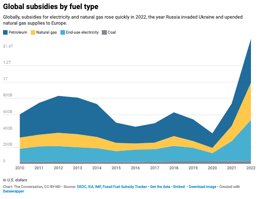 Yet these commitments have scarcely moved the needle. A major study of 157 countries between 2003 and 2015 found that governments “collectively made little or no progress” toward reducing subsidies. In fact, the OECD found that total global subsidies nearly doubled in both 2021 and 2022.