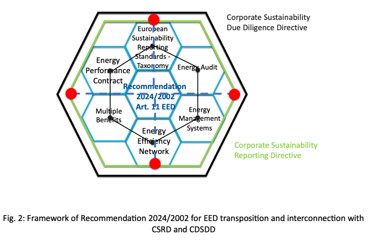 Recommendation 2024/2002 does not indicate connections with other Directives. Nevertheless, member states should consider in their own transposition process the integration and the interoperability of the EED requirements of the with the obligations of the CSRD and CSDDD as represented in Fig.2.