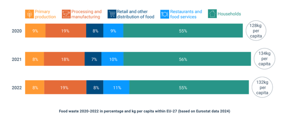 Food waste accounts for around 16% of total greenhouse gas emissions from the EU’s food system. According to the European Commission, economic losses are estimated at €132 billion per year due to food being thrown out. Wasting food means that all the resources needed for its production, such as soil, water and energy, are also wasted.