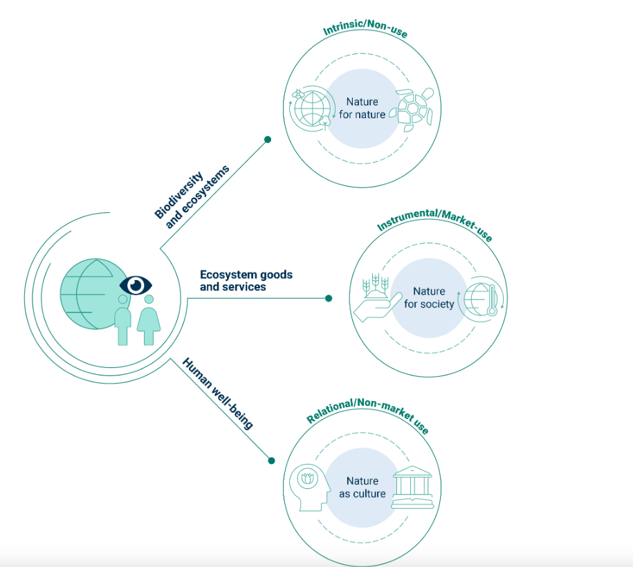 It is important to recognise that humans and nature have always been connected, and the nature of this relationship has evolved over time (IPBES, 2022). There are three primary ways humans perceive and value nature (e.g. EEA, 2021; IPBES, 2019, 2022; Bastien-Olvera et al., 2023).