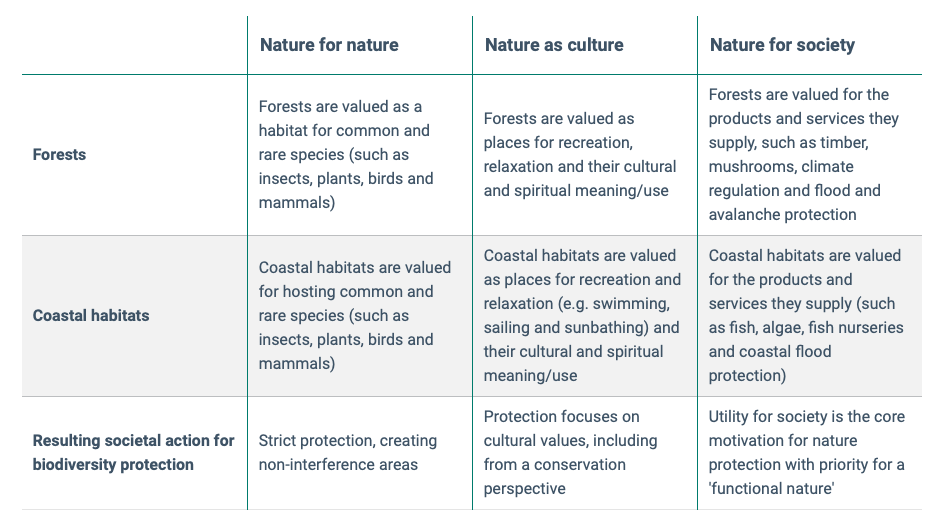 The three perspectives on our relationship with nature are illustrated in Table 1 based on two concrete examples: forests and coastal habitats, such as estuaries and seagrass meadows.