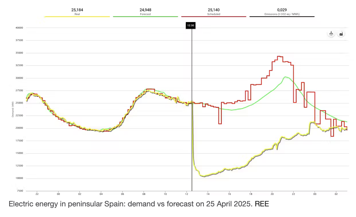 In the five minutes between 12:30 and 12:35, something anomalous happened which is still yet to receive an official explanation: a sudden drop in the Iberian electricity grid causes a total blackout.