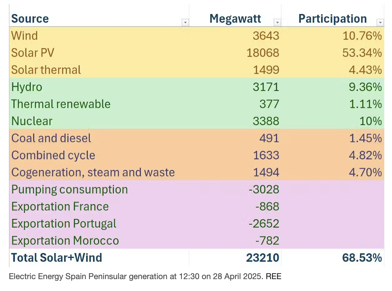 At that time the price of electricity on the official market was in the negative at around -1€/MWh. At these prices Spain was exporting electricity to Morocco, Portugal, and even France. In addition, much of the available energy was being used to pump water from low lying river basins into reservoirs – the only practical way to store energy on a large scale. However, this capacity has a limit and, with the reservoirs almost full, it cannot continue to be stored indefinitely.