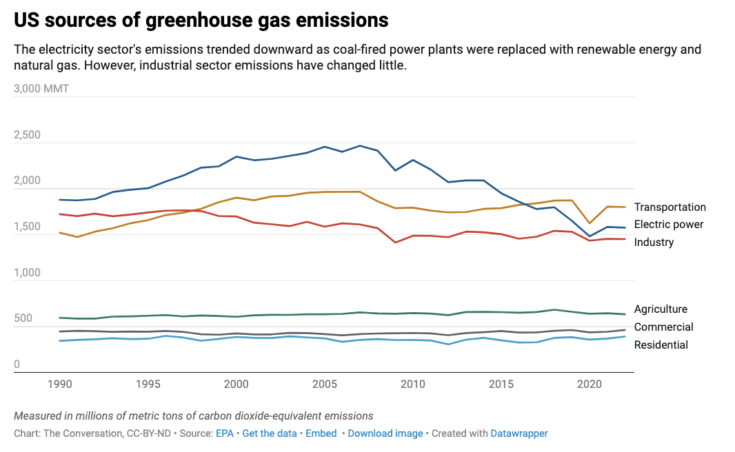 But U.S. industrial emissions have been mostly unchanged, in part because of the massive amount of coal, gas and oil required to make steel, concrete, aluminum, glass and chemicals. Together these materials account for about 22% of U.S. greenhouse gas emissions.