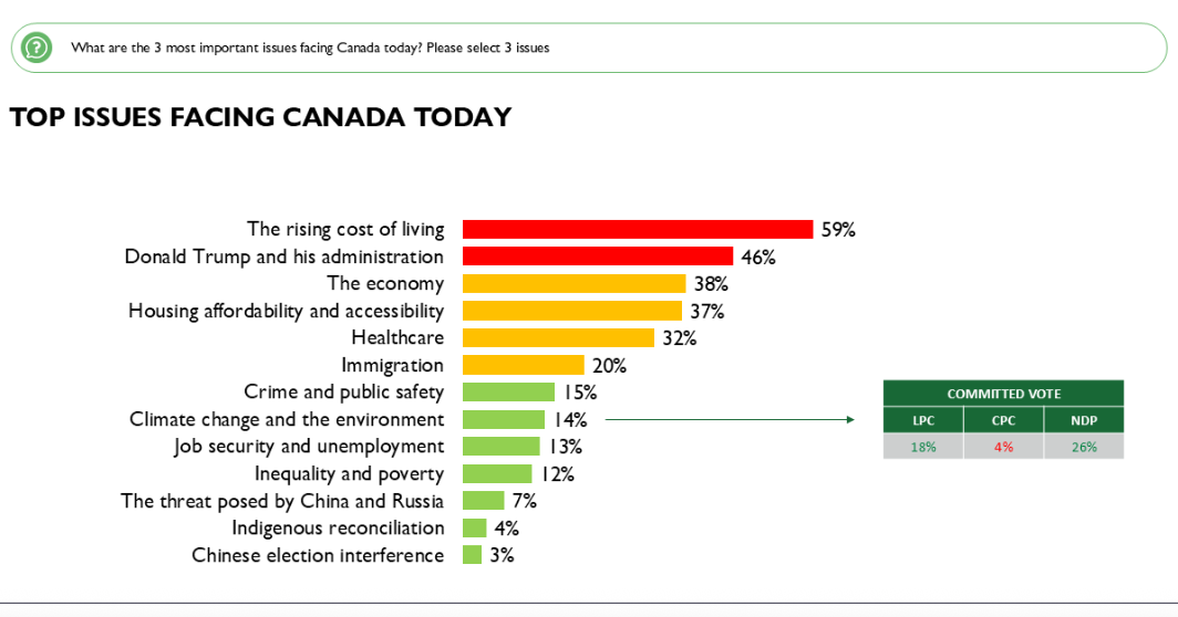 For much of the past year, the top issues facing Canadians have remained steady: the cost of living, healthcare, housing, and – more recently – Donald Trump and his administration. In this context, climate change has slipped down the list of urgent public issues, with only 15% now ranking it among their top three concerns. While still important, climate change is being overshadowed by more immediate, day-to-day worries. Political lines further shape this outlook, with 18% of Liberal voters and 26% of NDP supporters naming it as a top issue, compared to just 4% of Conservative supporters.