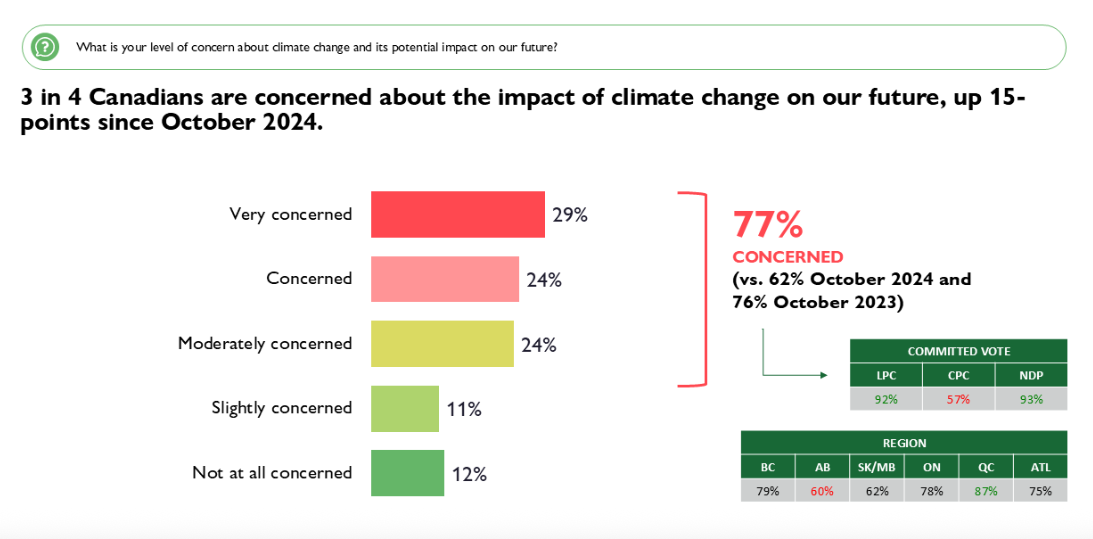 Yet despite Canadians’ day-to-day focus on other issues, concern about the long-term impact of climate change remains high, with 77% of Canadians noting that thy are worried about climate change’s future effects. This marks a significant 15-point jump in concern since October 2024, suggesting that, while Canadians may not be prioritizing climate action right now, they are far from complacent. Concern is especially strong among Liberal (92%) and NDP (93%) supporters, but even among Conservative voters, a majority (57%) express worry about the future.