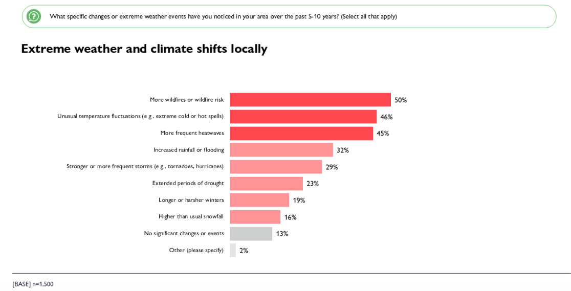 When asked about changes they’ve noticed in their own communities over the past 5 to 10 years, Canadians point to a range of disruptions: more wildfires or wildfire risk (50%), unusual temperature fluctuations (46%), more frequent heatwaves (45%), increased rainfall or flooding (32%), and stronger or more severe storms (29%). Only 13% say they haven’t witnessed any significant changes.