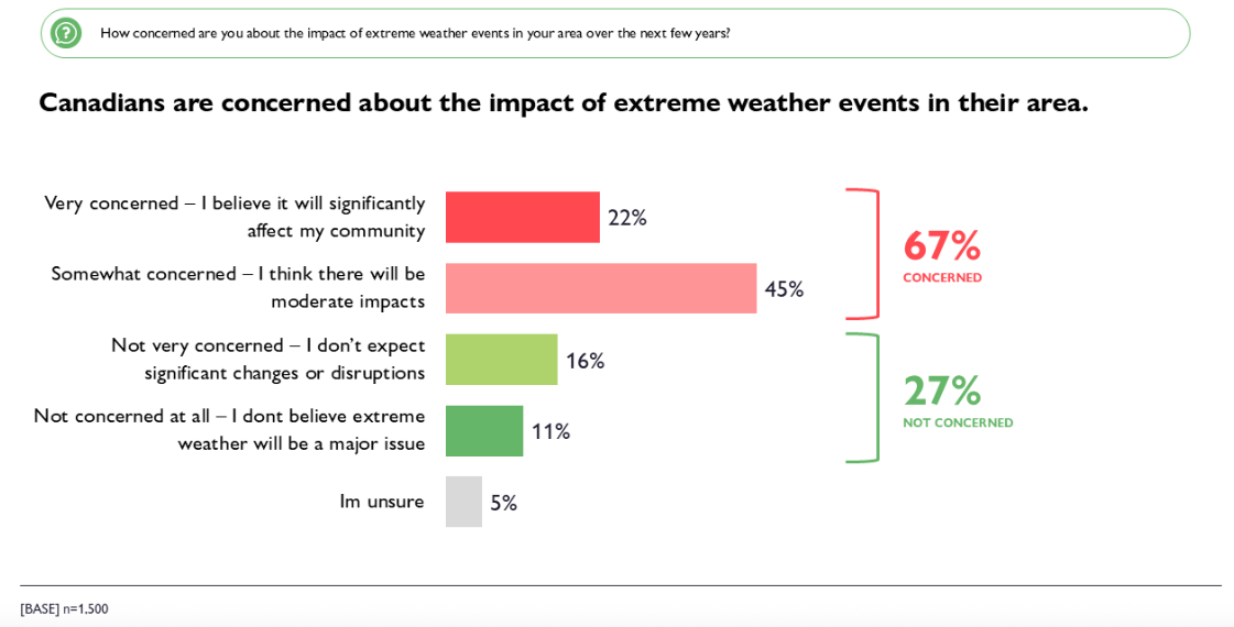 Reflecting these lived experiences, 67% of Canadians are concerned about the impact of extreme weather events in their area over the next five years. This shows that concern about climate change isn’t just abstract – it’s becoming personal for many, as more Canadians feel the effects firsthand in their own communities.