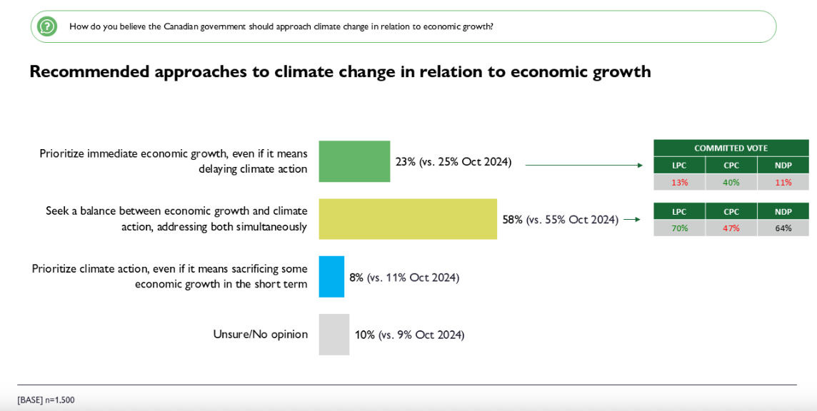 Again, there are notable political differences. Support for balancing the economy and climate is strongest among Liberal (70%) and NDP (64%) supporters, but nearly half of Conservative supporters (47%) also favour this approach. For the Liberal government, this emphasis on balance presents both an opportunity and a challenge: pursuing policies that demonstrate progress on both economic and environmental goals could help maintain and broaden support, but any perceived failure to deliver on either front risks alienating their core base as well as persuadable voters looking for a middle path.