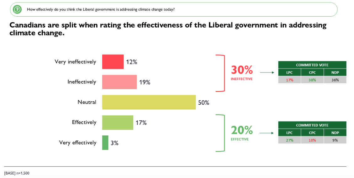 Despite the strong public desire for meaningful climate action, many Canadians are dissatisfied with the Liberal government’s performance on this front. Only 20% feel the Liberal government is effectively addressing climate change, while a larger share (30%) believe it is falling short. Even among committed Liberal supporters, fewer than three in ten (27%) believe the government is delivering real progress on the issue. For the government, the gap between expectations and perceived results is a clear warning sign that more visible leadership and tangible progress are needed to regain public confidence, especially if the issue becomes more salient.