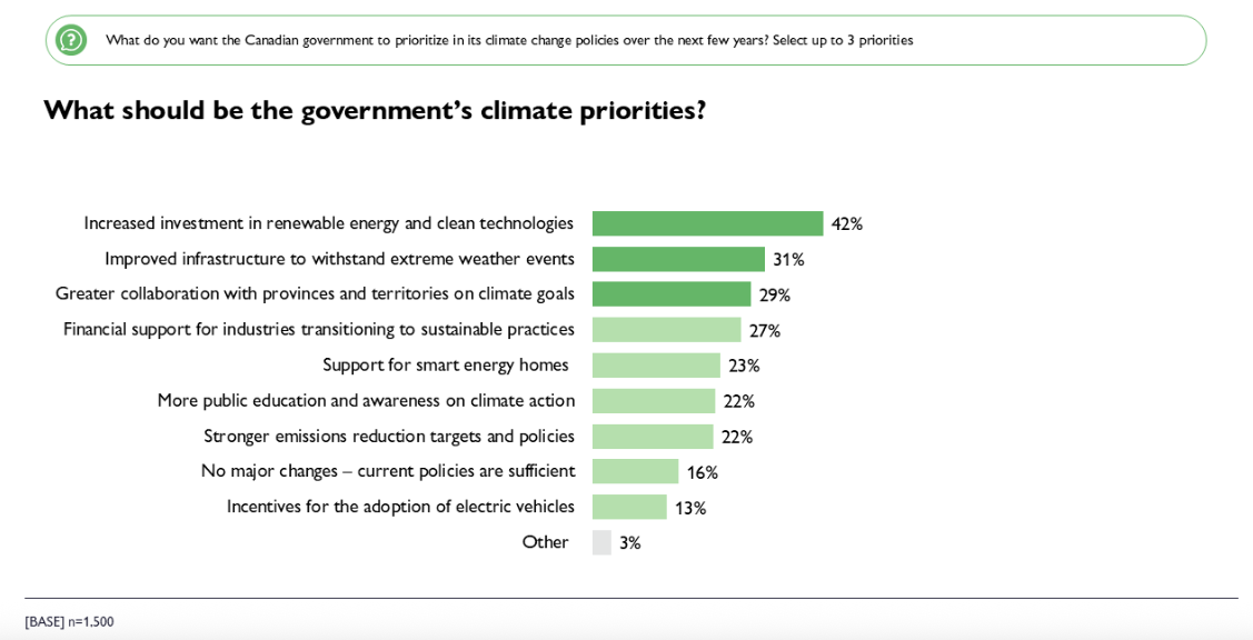Asked what the federal government should focus on over the next few years, Canadians point to increased investment in renewable energy and clean technology (42%), improved infrastructure to withstand extreme weather (31%), and more collaboration with provinces and territories on climate goals (29%). Many also support targeted incentives: 27% want financial support for industries transitioning to sustainable practices, 23% would like to see more support for smart energy homes, and 13% want further incentives to adopt electric vehicles. These results make it clear that Canadians want to see practical, forward-looking policies that both strengthen the economy and help communities adapt to a changing climate.