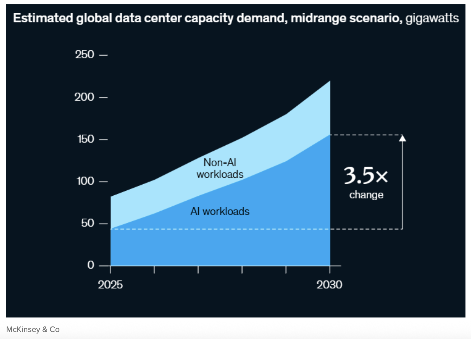 The stratospheric rise in forecast AI workloads could drive about 70 per cent of new electricity demand, McKinsey found, with the estimated global data centre capacity demand in its “mid-range” scenario expected to rise 3.5-fold to close to 250 gigawatts by 2030. In the US, this means the sector would account for almost 12 per cent of total national energy demand, up from just over five per cent today.