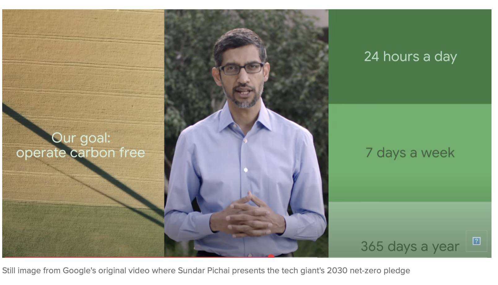 “Today, I’m proud to announce that we intend to be the first major company to operate carbon free — 24 hours a day, seven days a week, 365 days a year,” he said, in a video announcement at the time.