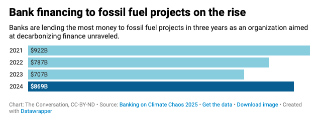 European banks that sharply cut funding to fossil fuel companies saw their business diverted to other banks and to private, nonbank sources of finance, which has soared in the past two years. Facing this loss of business, major banks’ lending to oil and gas companies surged in 2024, driving loans to a three-year high of $869 billion.