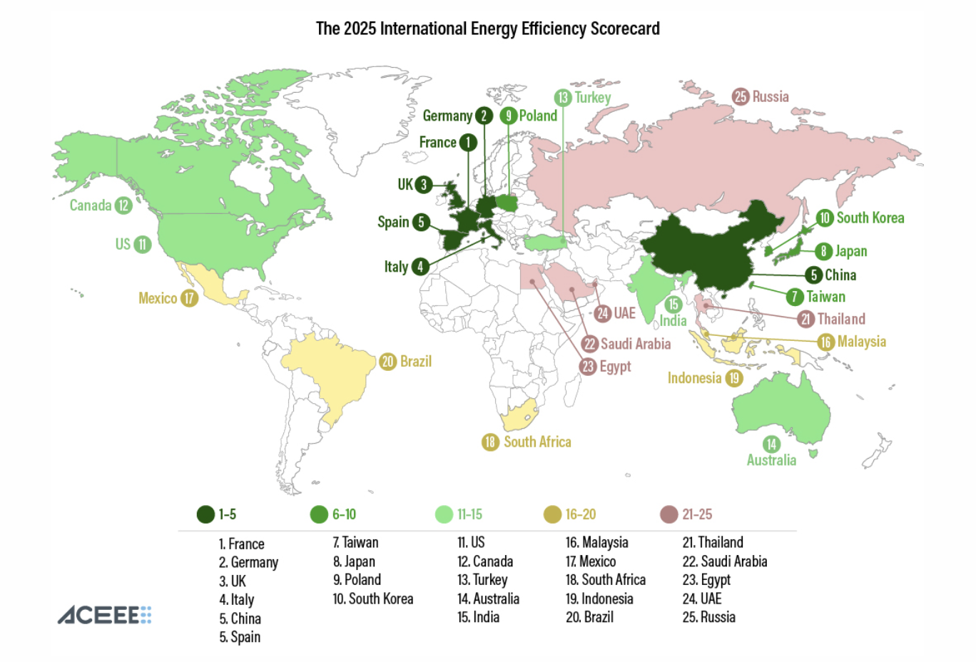 ACEEE’s 2025 International Energy Efficiency Scorecard ranks the top 25 highest energy-consuming countries on their energy efficiency policies and performance. The Scorecard evaluates their energy efficiency progress in four areas: national efforts, buildings, industry, and transportation.