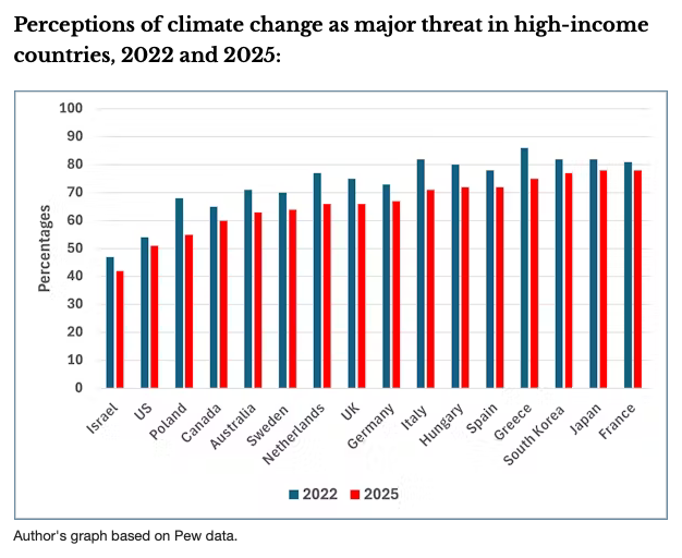 Changing public attitudes to climate change are tracked in detail by non-partisan thinktank Pew Research Center as part of massive global project. Drawing on this Pew data, the chart below shows the percentage of people in the 2022 and 2025 surveyswho considered climate change a major threat across 16 high-income countries.