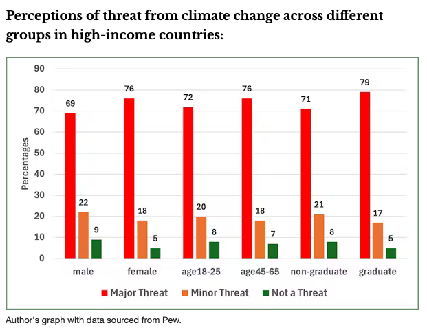 Some demographics of attitudes to climate change in the Pew surveys appear in the chart below. The responses in the 16 high-income countries look at variations in age, sex and education, and perceptions of the threat from climate change.