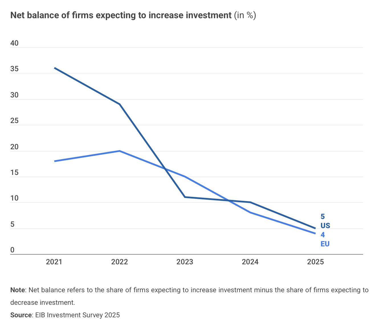 The European Investment Bank Investment Survey finds that 86% of EU firms still plan to invest, compared with 87% in the 2024 survey, although their appetite has somewhat weakened. A marginally higher share of EU firms still expects to increase rather than decrease investment in 2025, and investment growth is waning. The pattern in the United States is broadly similar.