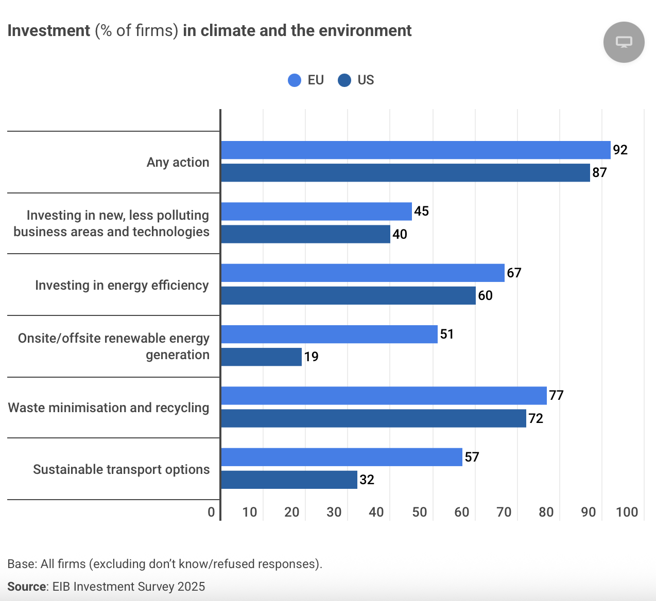 EU firms have been more proactive in reducing their greenhouse gas emissions. A higher share of them, 92%, have taken action to reduce those emissions. European firms are also more likely to invest in sustainable transport and renewable energy as well as other environmental measures, such as waste reduction and recycling.