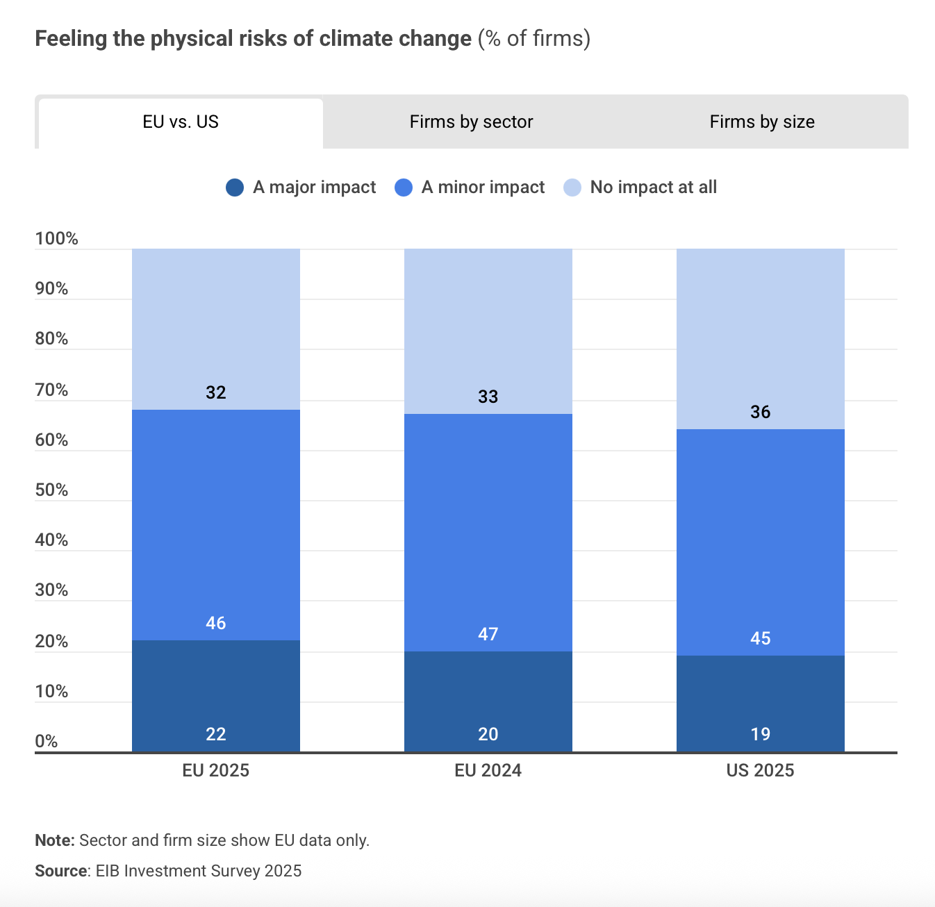 Overall, businesses are more aware of the physical risks associated with climate change and are slowly starting to act on climate adaptation. On both sides of the Atlantic, the share of firms faced with costs from extreme climate-related events is high: 68% in Europe, and 64% in the United States.