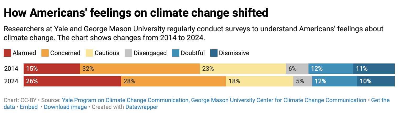 Annual surveys conducted by the Yale Program on Climate Change Communication have found that the percentage of Americans “alarmed” about climate change rose over the past 11 years – from 15% in 2014 to 26% in 2024. And they show that much of that increase came from an increase in concern among Americans who earlier considered themselves “concerned” or “cautious.”