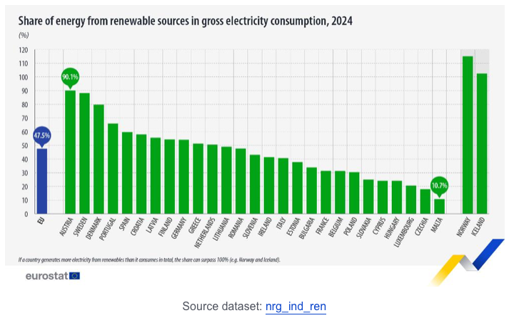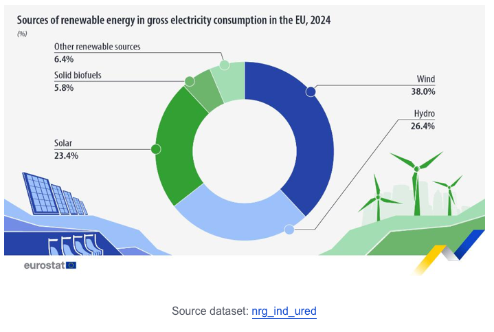 Eurostat has put out the following article this week on the generation of electricity from renewables in 2024.