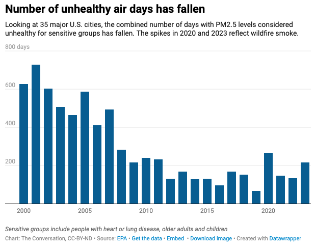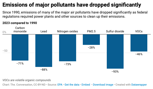 Denver still has air pollution problems, due in part to its geography, which creates temperature inversions that can hold pollution near the ground. But since 1990, ozone has decreased 18% across the U.S., reducing the smog that choked many cities in the 1960s and 1970s. The concentration of tiny dustlike particles of air pollution called PM2.5 has also decreased, by 37% since 2000.