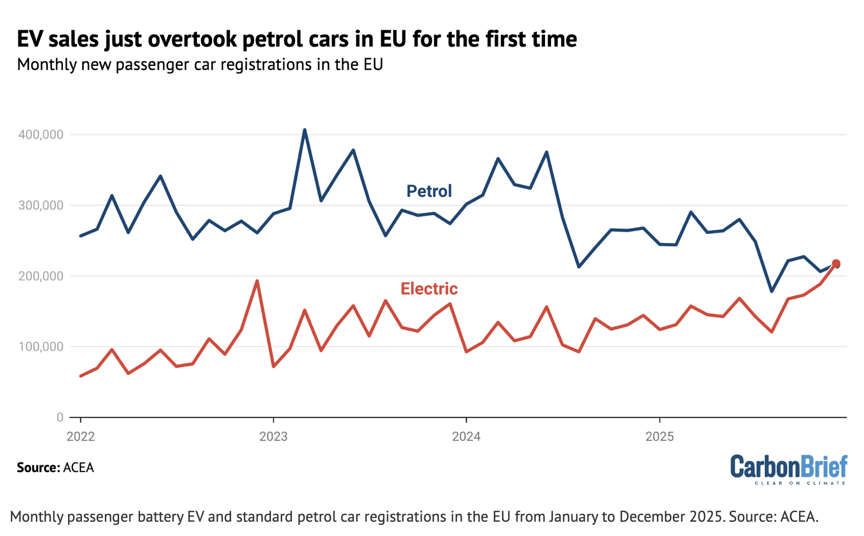 Meanwhile, sales of standard petrol cars in the bloc fell 19% year-on-year, from 267,834 in December 2024 to 216,492 in December 2025. (Note that this definition, from ACEA, excludes “hybrid” cars that only run on petrol, but also have a small battery.)