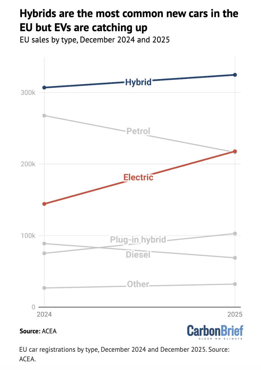 However, cars that can run on electricity from the grid – battery EVs and plug-in hybrids – are growing even faster, with sales up 51% and 36.7% in December 2025, respectively.