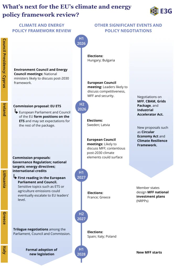 The review of the post-2030 framework is currently planned to start with Commission proposals in July (ETS) and December 2026 (Governance Regulation, national targets, energy directives, international credits). The Council and the Parliament may set expectations ahead of these moments and will discuss the content of the ETS revision in the second half of 2026 – at which point Europe is likely to be grappling with the impacts of an unfolding global energy crisis.