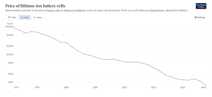 Furthermore, we’ve seen rapid progress in all components of the green energy transformation, even though their underlying technologies have little in common. Solar panels, wind turbines, and batteries are very different, yet all have seen revolutionary improvements. This strongly suggests that the whole renewable energy complex is experiencing a virtuous circle: ever-growing use leads to falling costs and falling costs lead to ever-growing use.