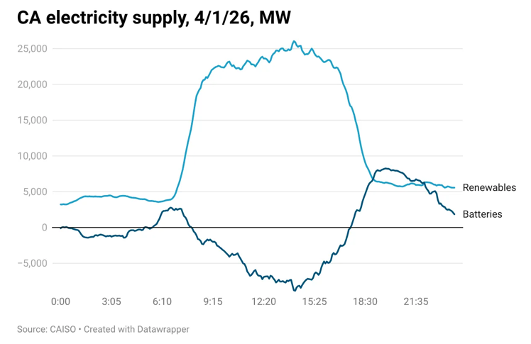 During the middle of the day, California generates lots of electricity from solar. Much of it is poured into batteries, which provide electricity when the sun sets. Californians don’t even notice the switch.