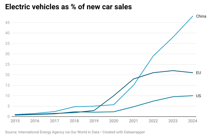 Second, battery performance has soared as prices have plunged. Crucially, there has been a huge increase in batteries’ volumetric energy density: the amount of electricity that can be stored in a given space. Until a few years ago the energy density of gasoline gave internal combustion a huge advantage over electric vehicles. But no longer. Outside the U.S. electrification, the transition away from petroleum and towards electricity — particularly green-sourced electricity — is well underway: