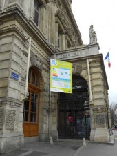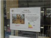 Public buildings are required to display an energy performance certificate, as mandated by the recast of the EU Energy Performance of Buildings Directive.  This is required for all buildings larger than 500 square metres.  That threshold will drop to 250 square metres in 2015.  The city hall of the 18th district (arrondissement) of Paris (where Montmartre is and close to the EiD office) has gone all out with an enlarged certificate that hangs on the outside of the building.